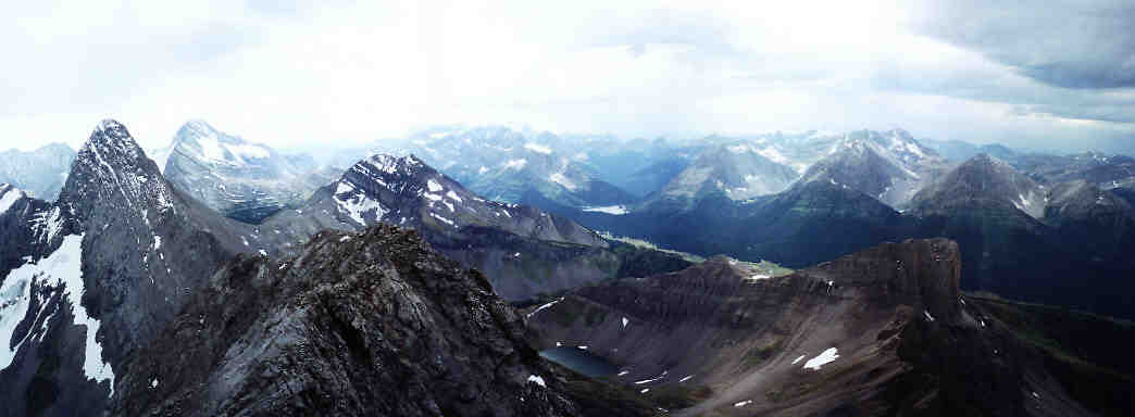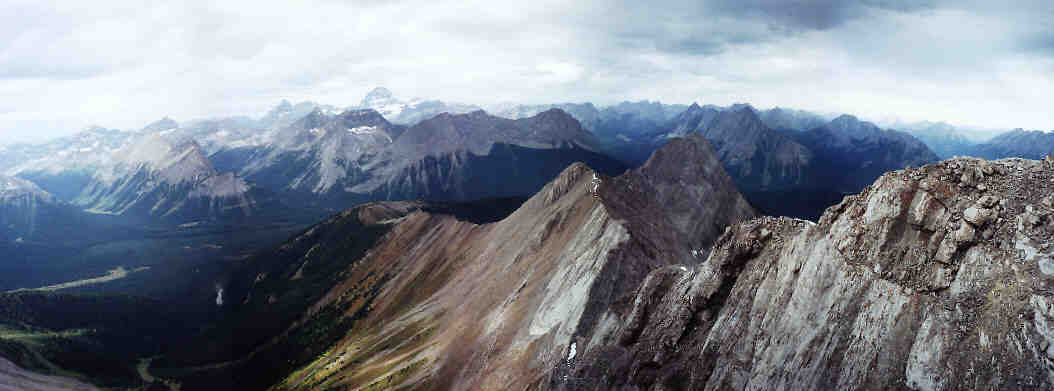 Mount Smuts. Mount Assiniboine is visible in the hazy distance.