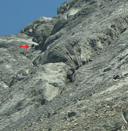 As if nocturnal porcupine attacks weren't exciting enough, Chris and Eddie, while packing up their tent the next morning (24 July 2004), spotted a young adult grizzly bear digging up the turf not far from their campsite. When I came by their tent to have a look for myself, the bear began wandering in our general direction. Suddenly, the bear must have caught wind of our presence because it promptly turned around, splashed across Aster Creek, and proceeded to climb up the hill north of the campground. Once it got sufficiently far enough from us, the bear resumed its diggings on the hill. Meanwhile, we calmly packed our gear and headed to Aster Lake to ford the outlet stream. We continued around the north shore of the lake and eventually climbed up the gully north of Warrior Mountain. Upon reaching the Continental Divide, we met a fellow by the name of Van Belliveau who had just traversed Mount Northover from south to north. He had arrived at Aster Lake campground late (we weren't even aware he was there) and also had a run-in with some porcupines (there was more than one?) during the night. Van actually recognized me from my website, so we had quite a long chat about scrambling and other related topics. He also gave us some useful route information about Northover Ridge before we parted ways.