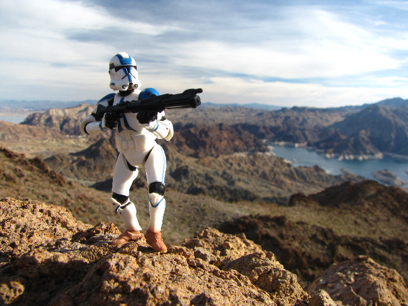 Back in Las Vegas, Nevada for a week-long vacation, Kelly Bou and I visited nearby Pinto Valley Wilderness (Lake Mead National Recreation Area) on 24 January 2011.  Looking for an easy hike to do, I chose to climb Hamblin Mountain as described by Jim Boone.  Despite having studied Boone's trip report as well as having uploaded his waypoints to my GPS, I still made a route-finding error partway through our ascent.  Fortunately, the terrain is not overly complex, and Kelly and I ended up climbing over a minor outlier before rejoining the normal route to the summit.  A register and several survey markers adorn the true summit of Hamblin Mountain, but strangely, the map in my GPS (Garmin's Topo USA 2008, version 4.00) designates a lower peak to the west as the official summit.  While Kelly was content to rest on the true summit, I expended a little extra effort to tag the lower peak.  We followed the normal route in its entirety on our uneventful return trip.