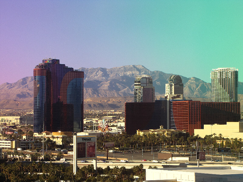 Past the Las Vegas Strip to the northeast are Sunrise Mountain (left of