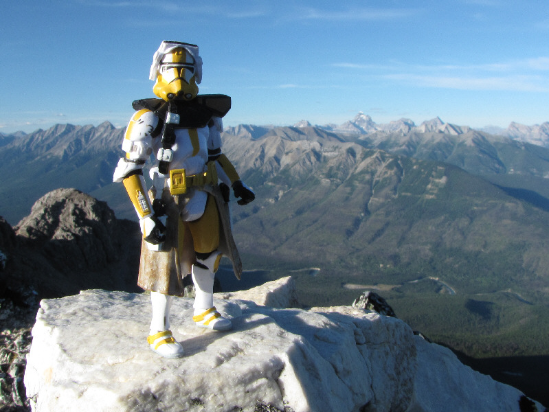 Too bad they're so far away! Some of the more prominent peaks on the eastern horizon include Mount Sir Douglas (far left), the Royal Group (right), and Mount Joffre (far right).
