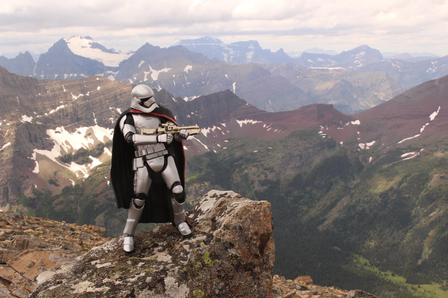 Bob and Dinah follow a game trail through the rubble. At centre is Apikuni Mountain. |