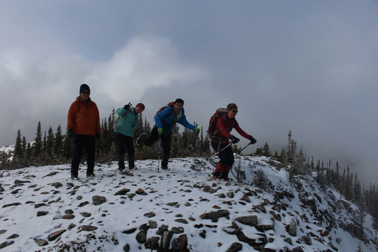 Without much else to see, we dropped down the west ridge of Tallon Peak far enough to circumvent some cliff bands before continuing along the connecting ridge to Robertson Peak.  Along the way, we encountered a few snow patches that were still deep enough to post-hole, but thankfully, these were short-lived and of little consequence especially after Zosia broke trail for the rest of us!  We also hiked over an intervening unnamed high point which someone like Vern Dewit might count as a separate summit!  When we arrived at the summit of Robertson Peak, we were rewarded with a partial clearing of the cloud cover which afforded us our first somewhat expansive views of the day.