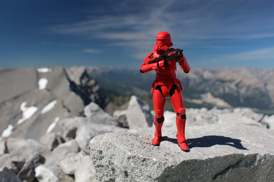 Bogart Tower looks like a baby mountain! Notable peaks to the south include Fisher Peak (far left horizon), Mount Kidd (left), Ribbon Peak (centre), Mount Kidd South Peak (right of centre), and Mount Bogart (right).
