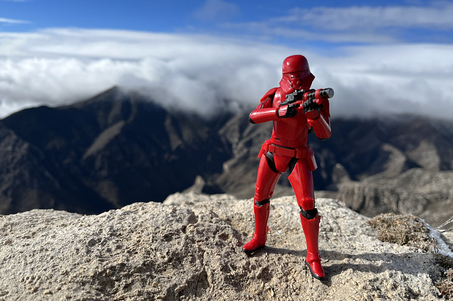 The top of Guadalupe Peak is still obscured by clouds as Zosia continues along Tejas Trail. |